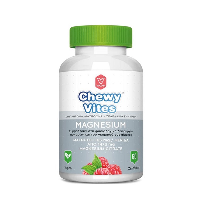 Τα Chewy Vites Magnesium περιέχουν 165mg μαγνήσιο από κιτρικό μαγνήσιο ανά μερίδα (2 ζελεδάκια), που υποστηρίζουν τη φυσιολογική λειτουργία των μυών και του νευρικού συστήματος. Το μαγνήσιο συμβάλλει, επίσης, στη φυσιολογική ψυχολογική λειτουργία, στη φυσιολογική λειτουργία των μεταβολικών διεργασιών που αποσκοπούν στην παραγωγή ενέργειας και στη μείωση της κούρασης και της κόπωσης.