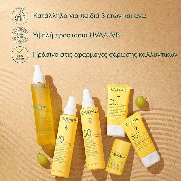 Το Invisible High Protection Stick SPF50 Vinosun Protect προστατεύει με μία μόνο κίνηση το πρόσωπο, τα χείλη και τις ευαίσθητες περιοχές (κρεατοελιές, ουλές, τατουάζ) από τις ακτίνες UVA/UVB χωρίς να αφήνει υπολείμματα. Η σύνθεσή του, πλούσια σε έλαιο από κουκούτσια σταφυλιού και βιολογικό έλαιο μπουρίτι, προσφέρει θρέψη χωρίς να είναι λιπαρή. Χωρίς άρωμα και ανθεκτικό στο νερό, είναι κατάλληλο τόσο για ενήλικες όσο και για παιδιά 3 ετών και άνω.