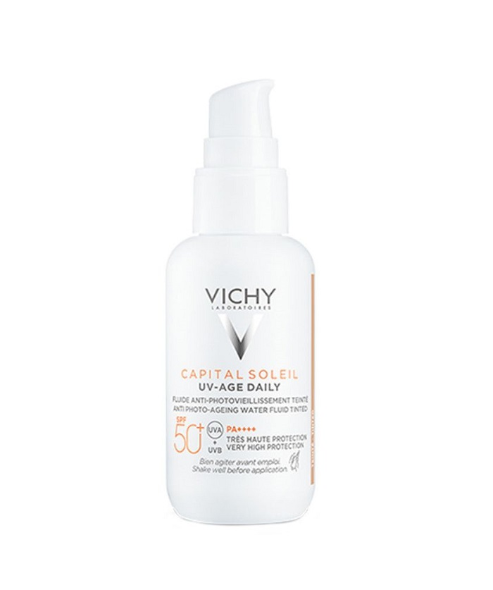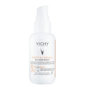 Το UV-Age Daily με Χρώμα της Vichy είναι ένα εξαιρετικά λεπτόρρευστο αντηλιακό προσώπου που προσφέρει πολύ υψηλή προστασία SPF50+ ενώ ταυτόχρονα διορθώνει τα σημάδια φωτογήρανσης.